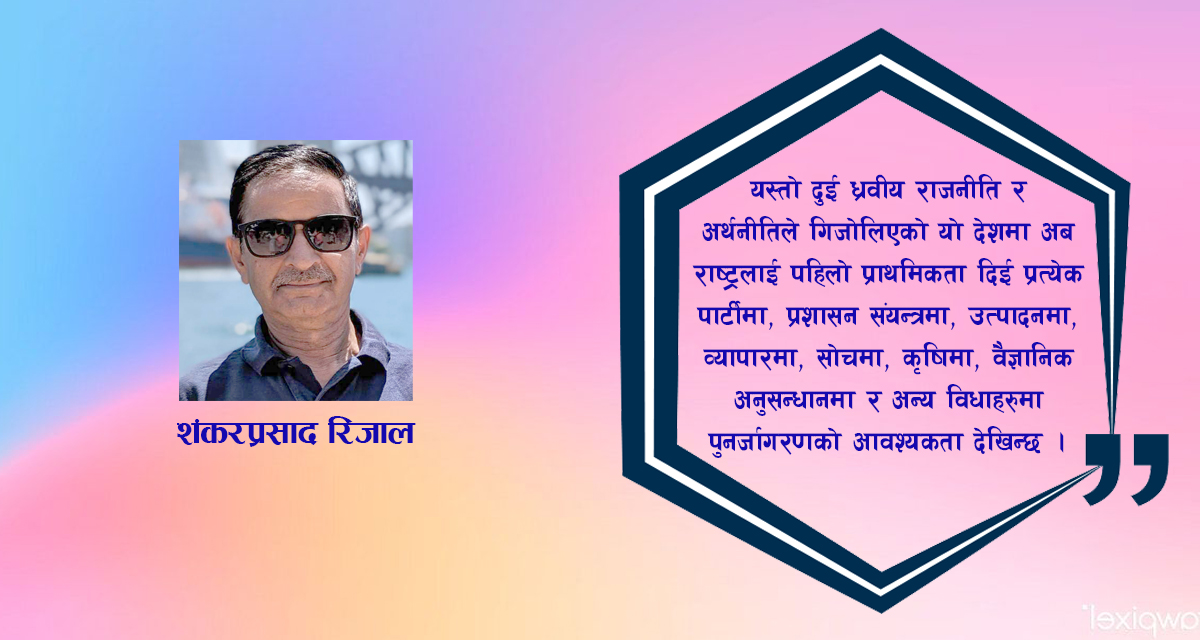 यस्तो दुई ध्रवीय राजनीति र अर्थनीतिले गिजोलिएको यो देशमा अब राष्ट्रलाई पहिलो प्राथमिकता दिई प्रत्येक पार्टीमा, प्रशासन संयन्त्रमा, उत्पादनमा, व्यापारमा, सोचमा, कृषिमा, वैज्ञानिक अनुसन्धानमा र अन्य विधाहरुमा पुनर्जागरणको आवस्यकता देखिन्छ। अन्यथा यो देश नेपालको राजनीति र अर्थनीति दुवै बिदेशीको पोल्टोमा परी अनाथ आश्रम जस्तो बन्ने निश्चित छ।
