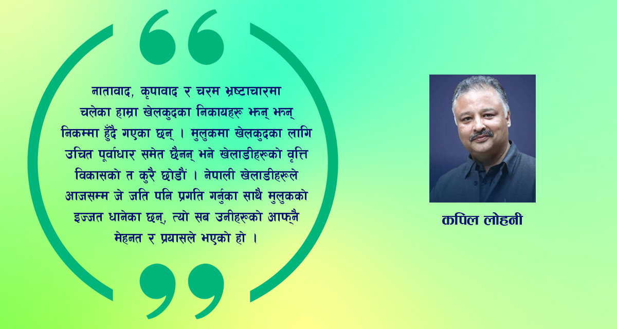 वास्तवमा दक्षिण एशियामा खेलकुद क्षेत्रमा सबैभन्दा धेरै भाँडभैलोको स्थिति नेपालमा नै छ। नातावाद, कृपावाद र चरम भ्रष्टाचारमा चलेका हाम्रा खेलकुदका निकायहरू झन् झन् निकम्मा हुँदै गएका छन्।