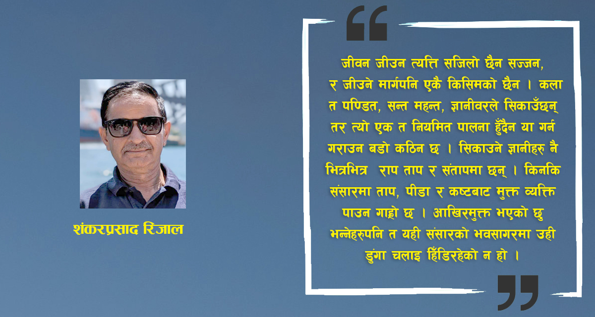 जीवन जीउन त्यत्ति सजिलो छैन सज्जन, र जीउने मार्गपनि एकै किसिमको छैन। कला त पण्डित, सन्त महन्त, ज्ञानीवरले सिकाउँछन् तर त्यो एक त नियमित पालना हुँदैन या गर्न गराउन बडो कठिन छ।