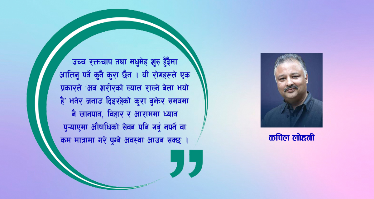 उच्च रक्तचाप तथा मधुमेह शुरु हुँदैमा आत्तिनु पर्ने कुनै कुरा छैन। यी रोगहरूले एक प्रकारले ‘अब शरीरको ख्याल राख्ने बेला भयो है!’ भनेर जनाउ दिइरहेको कुरा बुझेर समयमा नै खानपान, विहार र आराममा ध्यान पुर्याएमा औषधिको सेवन पनि गर्नु नपर्ने वा कम मात्रामा गरे पुग्ने अवस्था आउन सक्छ।