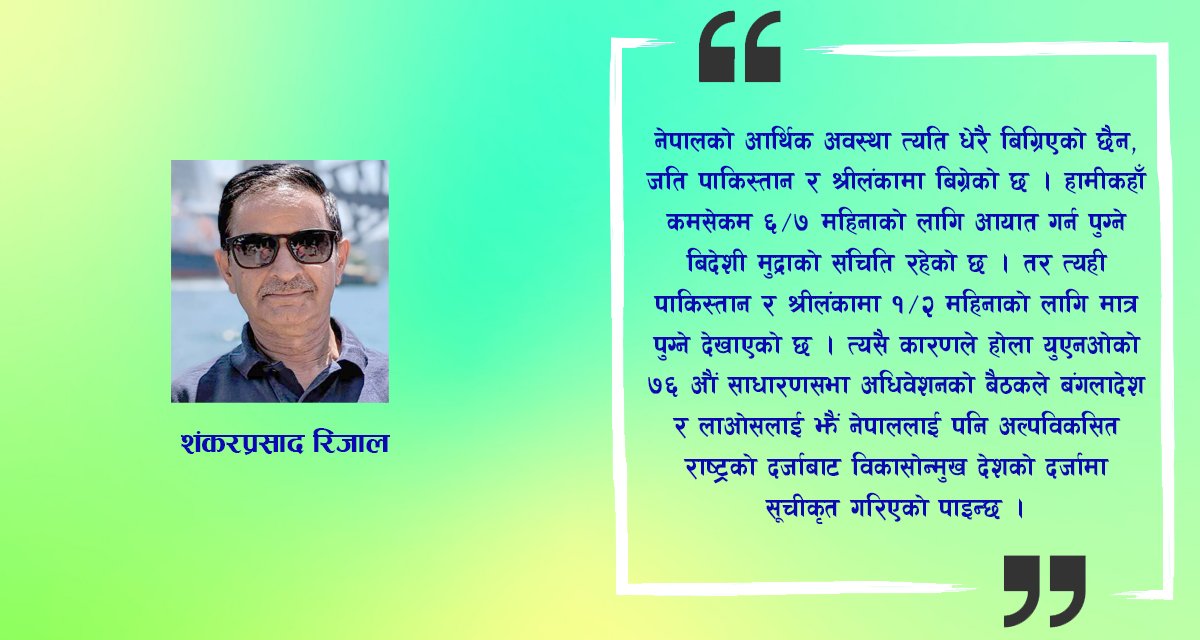 हामीकहाँ कमसेकम ६-७ महिनाको लागि आयात गर्न पुग्ने बिदेशी मुद्राको संचिति रहेको छ। तर त्यही पाकिस्तान र श्रीलंकामा १-२ महिनाकोलागि मात्र पुग्ने देखाएको छ। त्यसै कारणले होला युएनओको ७६ औं साधारणसभा अधिबेशनको बैठकले बंगलादेश र लाओसलाई झैं नेपाललाई पनि अल्पबिकसित राष्ट्रको दर्जाबाट विकासोन्मुख देशको दर्जामा सूचीकृत गरिएको पाइन्छ।
