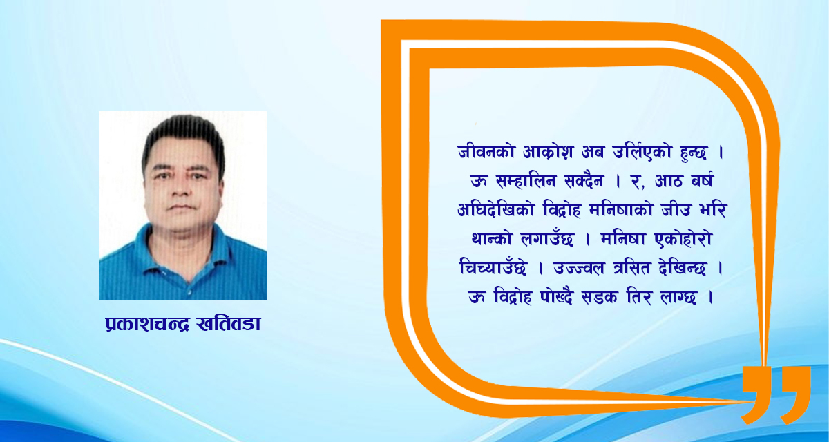 जीवनको आक्रोश अब उर्लिएको हुन्छ। उ सम्हालिन सक्दैन। र आठ बर्ष अघिदेखिको बिद्रोह मनिषाको जीउ भरि थान्को लगाउँछ। मनिषा एकोहोरो चिच्याउँछे। उज्ज्वल त्रसित देखिन्छ। उ बिद्रोह पोख्दै सडक तिर लाग्छ।
