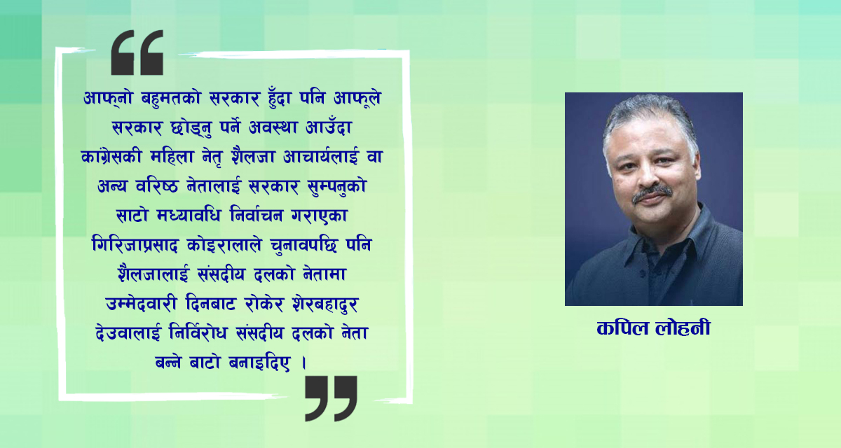 आफ्नो बहुमतको सरकार हुँदा पनि आफूले सरकार छोड्नु पर्ने अवस्था आउँदा कांग्रेसकी महिला नेतृ शैलजा आचार्यलाई वा अन्य वरिष्ठ नेतालाई सरकार सुम्पनुको साटो मध्यावधि निर्वाचन गराएका गिरिजाप्रसाद कोइरालाले चुनावपछि पनि शैलजालाई संसदीय दलको नेतामा उम्मेदवारी दिनबाट रोकेर शेरबहादुर देउवालाई निर्विरोध संसदीय दलको नेता बन्ने बाटो बनाइदिए।