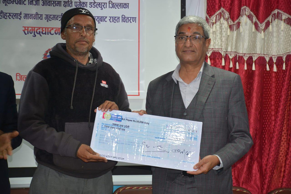 डडेल्धुरा । गृहमन्त्री रमेश लेखकले डेढ बर्षअघि डोटी भूकम्प प्रभावित लाभग्राहीलाई अनुदान रकम हस्तान्तरण थालनी गरेका छन् ।