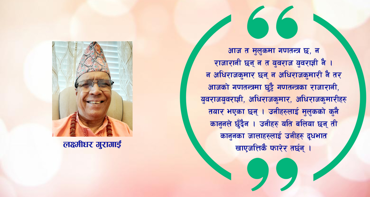 राजतन्त्रमा पो राजारानी, युवराज, युवराज्ञी, अधिराजकुमार, अधिराजकुमारी र उनीहरुको आउरेबाउरे हुन्थे आज त मुलुकमा गणतन्त्र छ , न राजारानी छन् न त युवराज युवराज्ञी नै। न अधिराजकुमार छन् न अधिराजकुमारी नै तर आजको गणतन्त्रमा छुट्टै गणतन्त्रका राजारानी, युवराजयुवराज्ञी, अधिराजकुमार, अधिराजकुमारीहरु तयार भएकाछन्। उनीहरुलाई मुलुकको कुनै कानुनले छुँदैन।