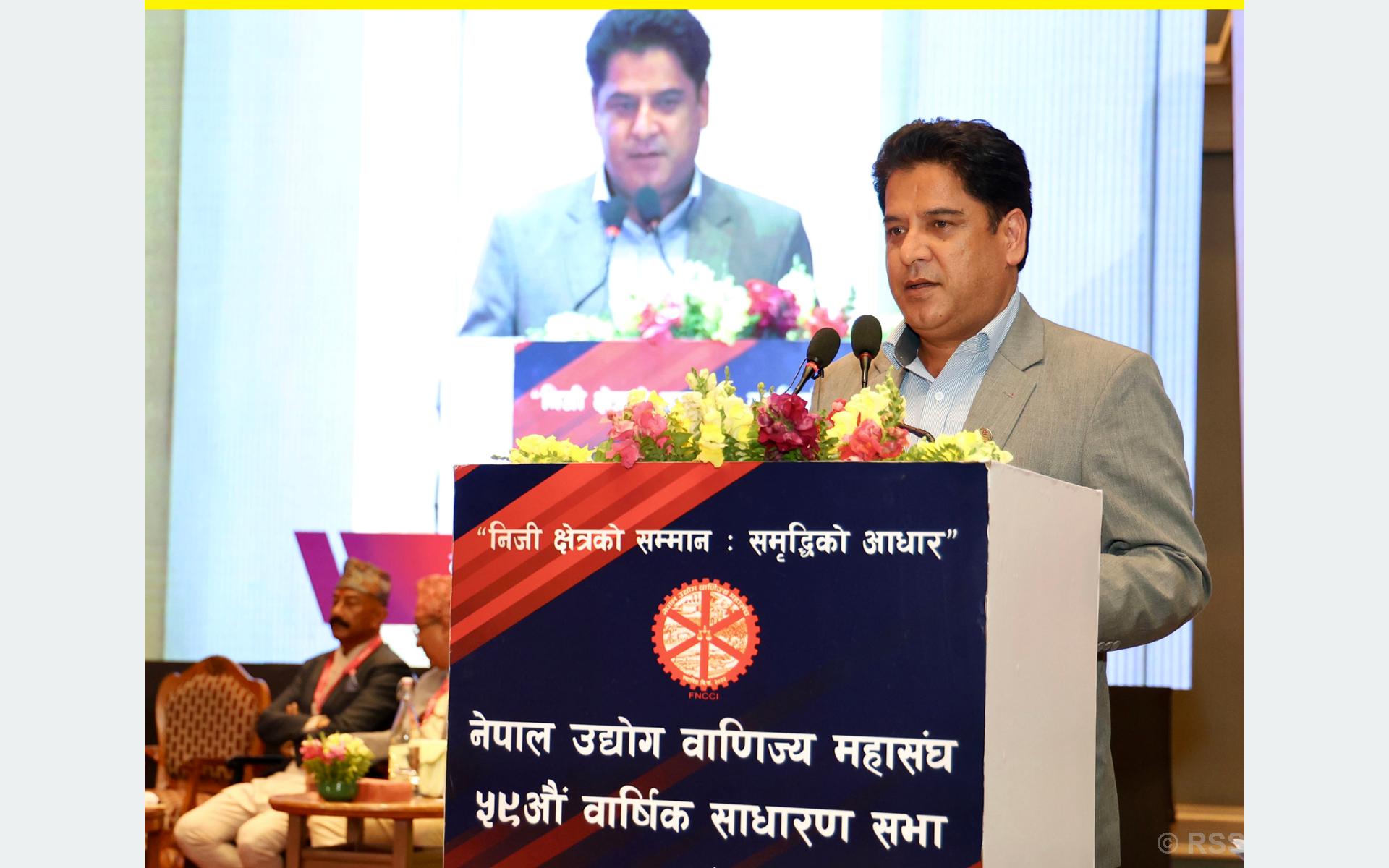 नेपाल उद्योग वाणिज्य महासंघको ५९औं साधारणसभाको उद्घाटन समारोहलाई आज सम्बोधन गर्दै उनले लगानीसम्बन्धी ऐन कानुनलाई समयसापेक्ष बनाउने, एकल विन्दु सेवालाई प्रभावकारी बनाउने र विदेशी लगानी आकर्षित गर्न विशेष पहल गरिएको बताए।