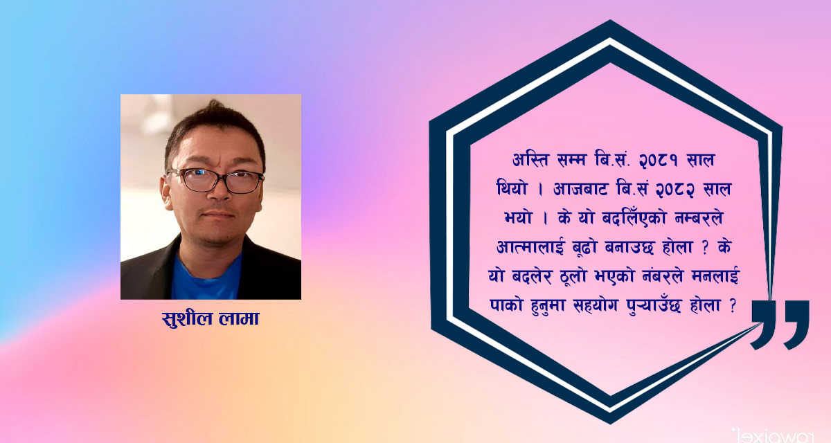 अस्ति सम्म बि.सं. २०८१ साल थियो। आजबाट बि.सं २०८२ साल भयो। के यो बदलिँएको नम्बरले आत्मालाई बूढो बनाउछ होला? के यो बदलेर ठूलो भएको नंबरले मनलाई पाक्को हुनुमा सहयोग पुर्याउछ होला?