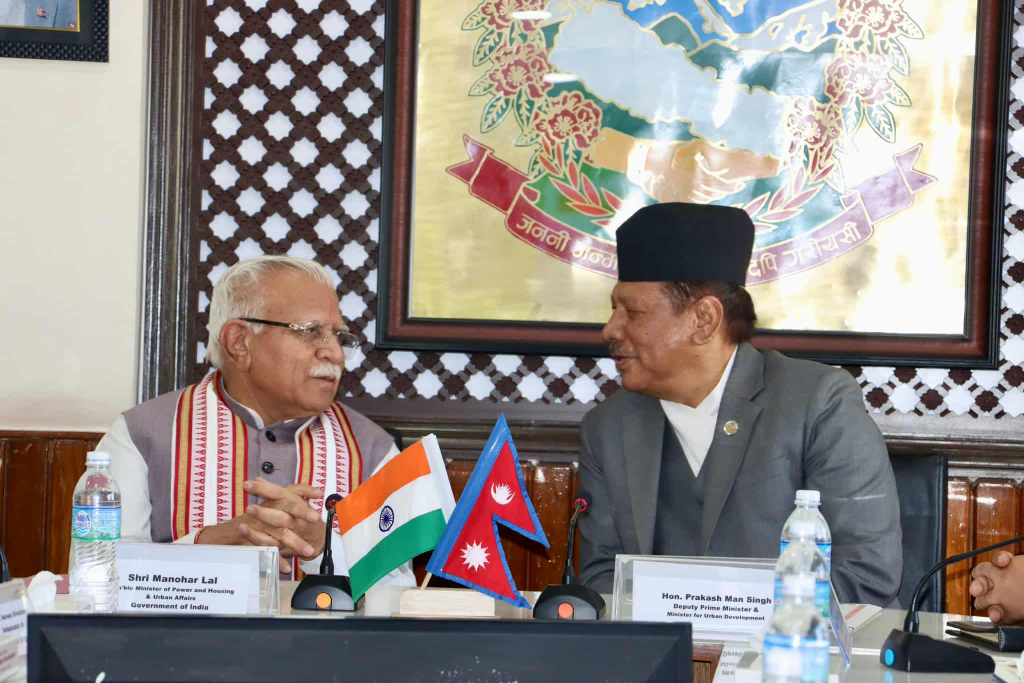 काठमाडौं । उपप्रधान एंव सहरी विकास मन्त्री प्रकाशमान सिंहसँग भारतका विद्युत्, आवास तथा सहरी मामिलामन्त्री मनोहरलाल भट्टरले शिष्टाचार भेट गरेका छन्।