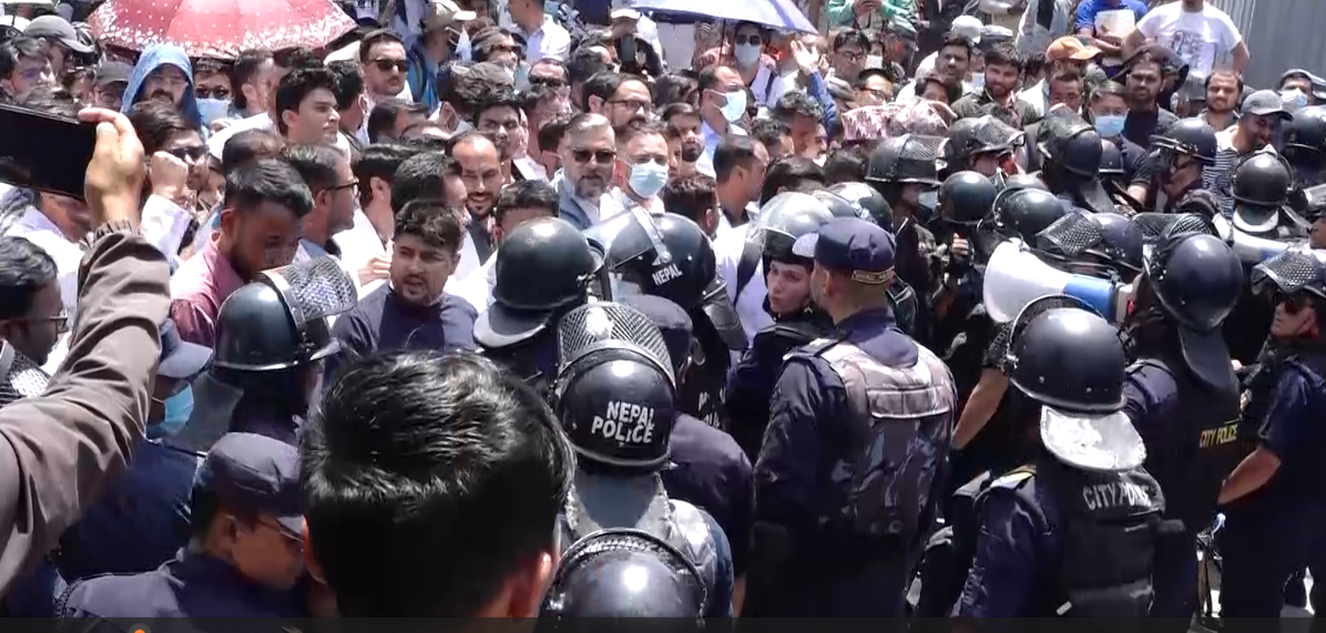 माइतीघरबाट प्रदर्शनसहित स्वास्थ्य मन्त्रालय जान खोजेका आन्दोलनरत चिकित्सकहरूलाई प्रहरीले रोकेको थियो। सो क्रममा केहिबेर प्रहरी र आन्दोलनरत चिकित्सकबीच धकेलाधकेलसमेत भएको थियो।