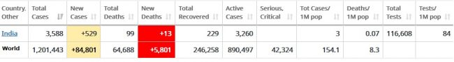 भारतमा आइतबार बिहानसम्म कोरोना भाइरसको संक्रमणबाट ३ हजार ५ सय ८८ जना संक्रमित भएका छन् । जसमध्ये शनिबार मात्रै ५२९ जना नयाँ संक्रमित थपिएका हुन् । भारतमा हालसम्म १ लाख १६ हजार ६ स ८ जनाको कोरोना टेस्ट गरिएको छ ।