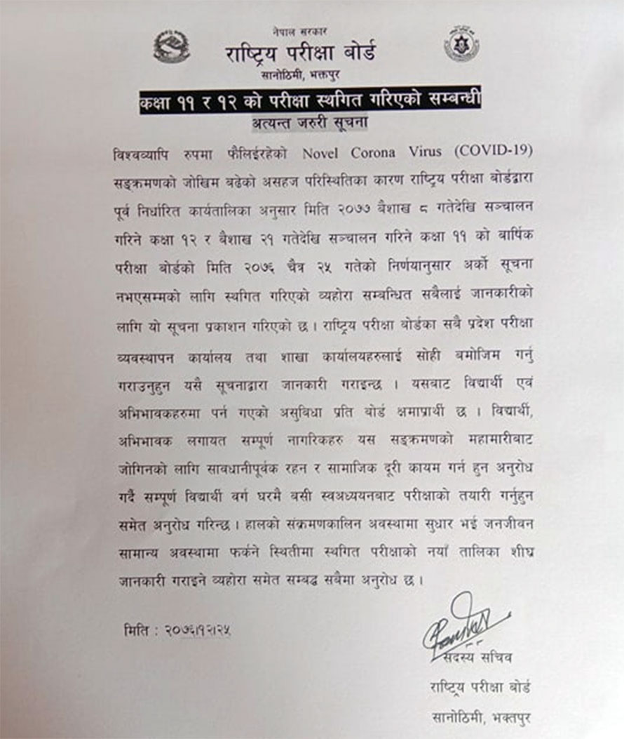 काठमाडौं। बैशाख ८ गतेबाट हुने कक्षा १२ र बैशाख २१ गतेबाट सुरु हुन भनिएको वार्षिक परीक्षा स्थगित भएको छ। कोरोना भाइरस संक्रमणका कारण सरकारले कक्षा ११ र १२को वार्षिक परीक्षा स्थगित गरेको हो।