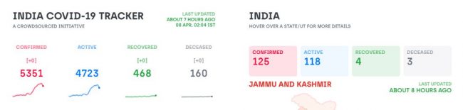 विभागले राति दुई बजे अपडेट गरेको सूचना अनुसार हिजो मंगलबार मात्रै ५७३ जना नयाँ संक्रमित फेला परेका छन् । यो सँगै भारतमा कोरोना संक्रमितको संख्या ५ हजार ३ सय ५१ पुगेको छ। १ लाख ४० हजार २ सय ९३ जनाको कोरोना टेस्ट गर्दा उक्त संख्यामा संक्रमित फेला परेका हुन् ।