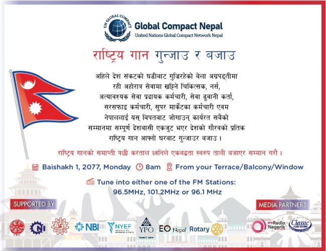 संयुक्त राष्ट्रसंघ ग्लोबल कम्प्याक्ट नेपालले अघि सारेको कार्यक्रमलाई प्रधानमन्त्री ओलीले समर्थन गरेका हुन् । ग्लोबल कम्प्याक्ट नेपालले भोलि(आइतबार) नयाँ वर्षको दिन विहान ८ बजे घरको छत वा झ्यालबाट राष्ट्रिय गान गाउन आह्वान गरेको छ।
