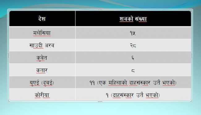 वैदेशिक रोजगार प्रबद्र्धन केन्द्रका कार्यकारी निर्देशक राजन श्रेष्ठका अनुसार, रोजगारीमा खाडी मुलुक गएका नेपालीमध्ये यो अवधिमा ६९ जना नेपालीहरुको विभिन्न कारणले मृत्यु भएको र उनीहरुको शव नेपाल ल्याउनु पर्ने अवस्था आएको हो ।