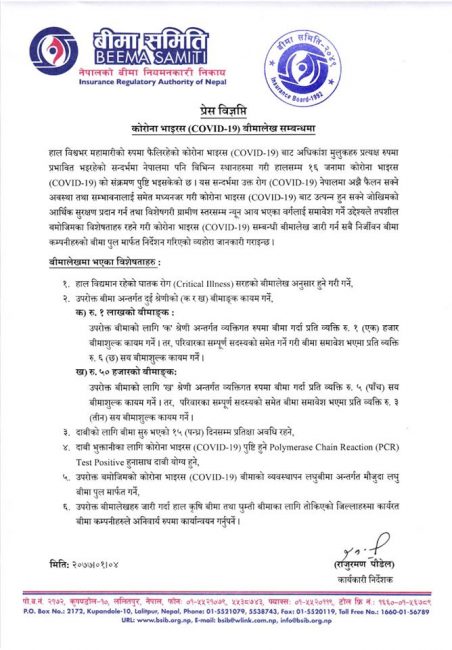 नेपालमा १६ जनालाई संक्रमण पुष्टी भएपछि बीमा समितिले बिहीबार सुरक्षाका लागि बीमा लेख जारी गर्न निर्देशन दिएको हो । ग्रामिण क्षेत्रसम्म न्यून आय भएको मानिसहरूमा जोखिम बढेकाले उनीहरुलाई आर्थिक सुरक्षण प्रदान गर्न बीमा योजना अघि सारिएको समितिले जनाएको छ ।
