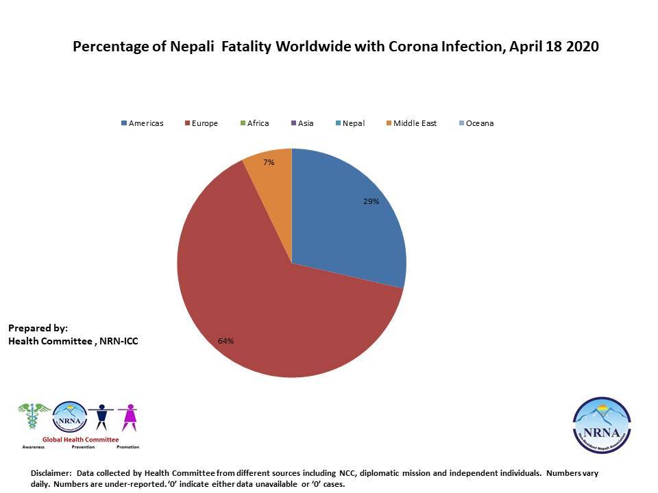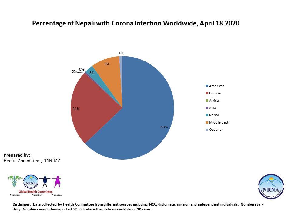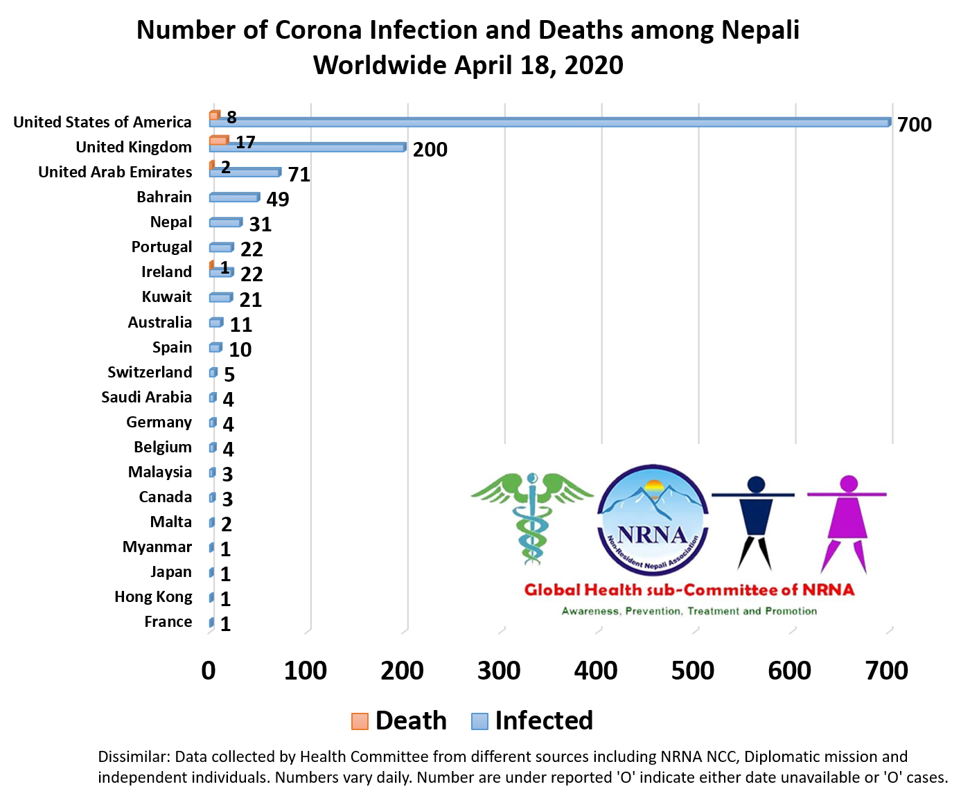 विश्वभर छरिएका गैरआवासीय नेपाली विज्ञ चिकित्सहरुको समूहले तयार पारेको सो तथ्यांक अनुसार २१ देशमा रहेका नेपालीहरु कोरोना भाइरस (कोभिड १९) बाट संक्रमित छन् ।