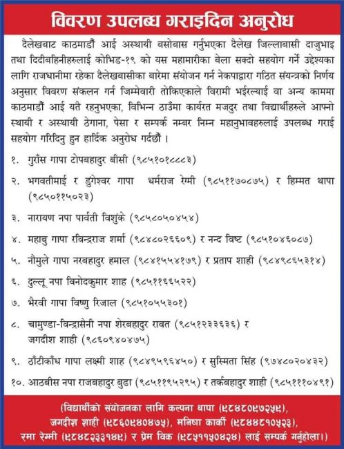 काठमाडौं । दैलेख जिल्लाबाट राजधानीमा आई विभिन्न पेशा व्यवसायमा आवद्धहरुलाई सहयोग गर्न प्रतिनिधिभाका सांसद राजवहादुर बुढा सहितको टोली सक्रिय भएको छ । कोरोना महामारीले लकडाउन हुँदा जिल्लाबाट राजधानीमा आएकाहरुलाई समस्या परेको खण्डमा उक्त टोलीले सहयोग गर्ने छ ।