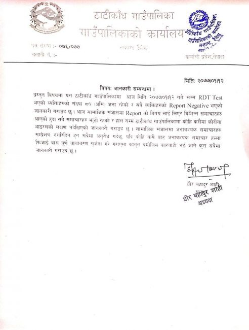 सामाजिक सञ्जालमा आएको भ्रम प्रति गाउँपालिकाले पनि ध्यानाकर्षण भएको जनाएको छ । गाउँपालिका प्रमुख धिरबहादुर शाहीले भ्रमको पछि लागेर त्रशित नहुँन पनि आग्रह गरेका छन् ।