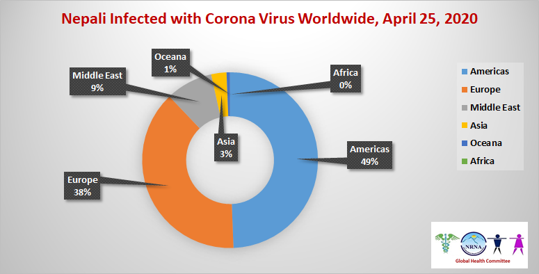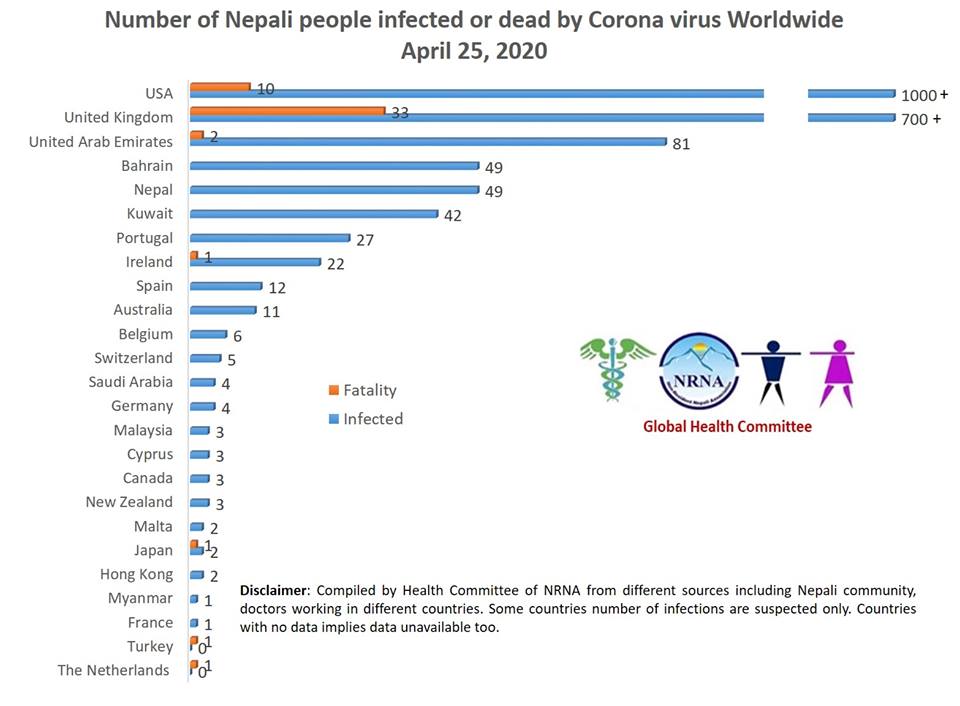 विश्वभर छरिएका गैरआवासीय नेपाली विज्ञ चिकित्सहरुको समूहले तयार पारेको सो आँकडा अनुसार २४ देशमा रहेका नेपालीहरु कोरोना भाइरस ९कोभिड १९० बाट संक्रमित छन् ।
