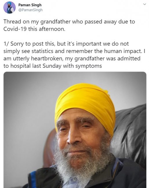 काठमाडौं । कोरोना भाइरसले भारतीय मूलका म्याराथन धावक अमरिक सिंहलाई पनि आफ्नो चपेटामा पारेको छ। विश्वको सबै भन्दा पुरानो म्याराथन धावक १०९ बर्षे फउजा सिंहको सबैभन्दा मिल्ने साथी र धावक साथी अमरिक सिंहले २२ अप्रिलमा बर्मिंघम सिटी अस्पतालमा अन्तिम सास लिए। अस्पतालमा डाक्टरहरूले उनका शब्दहरू बुझ्न र उनीहरूलाई बचाउन संघर्ष गर्नुपर्यो। ति शब्दहरू जुन उनको जीवनको अन्तिम शब्दहरू हुन्। अमरानका नाति ३४ वर्षीय पामन सिंहले आफ्नो हजुरबुबाको अन्तिम शब्द वाहेगुरु रहेको बताएका थिए। ग्लासगोमा बस्ने अमरिकले ६५० भन्दा बढी पदकहरू जितेका छन् जुन उनले विश्वभरि धेरै दौड प्रतियोगिता हरुमा जितेका थिए।