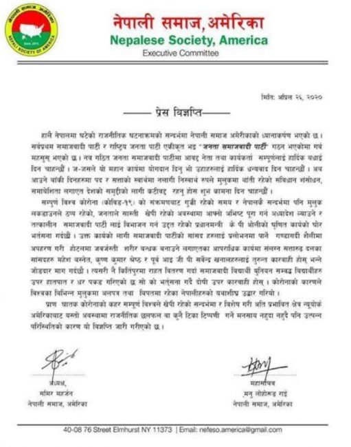अध्यक्ष समीर महर्जन र महासचिव मनु लोहोरुंगद्वारा हस्ताक्षरित उक्त विज्ञप्तिमा प्राण घातक कोरोनाको कहर सम्पूर्ण विश्वले खेपी रहेको सन्दर्भमा र बिशेष गरी अती प्रभावित क्षेत्र न्युयोर्क र अमेरिकाबाट यस्तो अवस्थामा राजनीतिक छलफल वा कुनै टिका टिप्पणी गर्ने मनशाय नहुँदा नहुँदै पनि उत्पन्न परिस्थितिको कारण बिज्ञप्ति जारी गरिएको जनाईएको छ ।