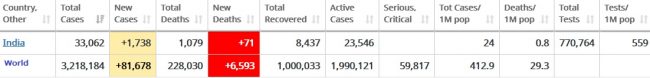 यो सँगै भारतमा कोरोनाबाट मृत्यु हुनेको संख्या १ हजार ७९ पुगेको छ ३३ हजार ६२ जना संक्रमित भएका छन्। बुधबार भारतमा १ हजार ७३८ जना नयाँ संक्रमित फेला परेका छन् । जसमध्ये ८ हजार ४ सय ३७ जनाको उपचार सफल भएको छ भने २३ हजार ५ सय ४६ जनाको उपचार जारी छ ।