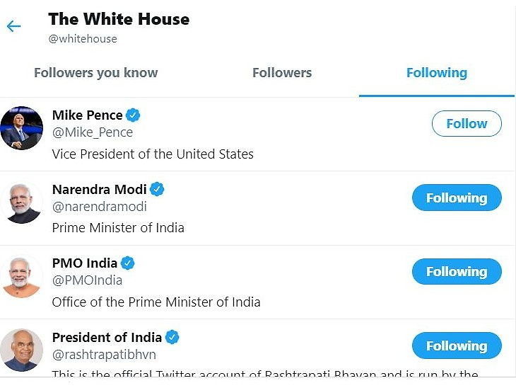 ह्वाइट हाउसको ट्विटर अकाउन्टको यो स्क्रीन शट त्यति बेलाको हो जतिबेला उसले भारतीय प्रधानमन्त्री र राष्ट्रपतिलाई फलो गर्न सुरु गरेको थियो।
