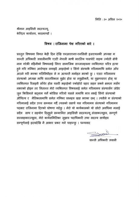 काठमाडौं। गैर आवासीय नेपाली संघ (एनआरएनए) इजरायलकी अध्यक्ष शान्ता अधिकारी ज्ञवालीले अध्यक्ष पदबाट राजीनामा दिएकी छिन् । उनले बिहीबार पदबाट राजीनामा दिएकी हुन् । इजरायलमा कार्यरत ज्ञवालीमाथि आफ्नै सहकर्मीको जागिर खोसेको आरोप लागेको थियो ।