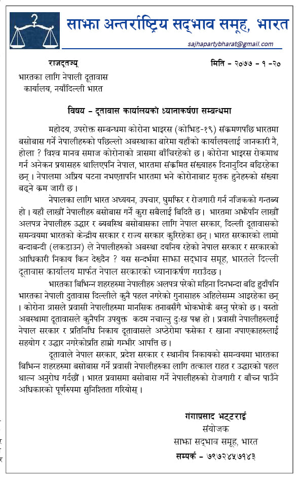 ‘दिल्ली मुंबईसहित भारतका विभिन्न राज्यमा नेपालीहरु अलपत्र परेको ४४ दिन हुँदासम्म नेपाली दूताबासले कुनै पहल नगरिएको गुनासो आइरहेको छ। दूतवासले भारतमा अलपत्र परेका पीडितलाई आउँदो समयमा सरकारले गरेको निर्णय सम्मको जानकारी दिन सकेको छैन। कोरोनाको त्रासले प्रवासी भोक भोकै त थिए तर अब मानसिक रुपले डिप्रेसन भएका छन्। यस्तो अवस्थामा पनि दूताबासले कुनै कदम नचाल्नु दुखद् पक्ष हो’, संयोजक भट्टराईले भने।