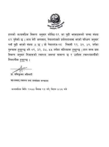 मन्त्रालयका सह-प्रवक्ता डा समिरकुमार अधिकारीले एक विज्ञप्ती जारी गर्दै भेरी अञ्चल अस्पतालमा भएको कोरोना परीक्षणका क्रममा २२, ३० र ४० वर्षका पुरुष र ९, ३२, ३४ र ५५ वर्षका महिलामा कोरोना पुष्टि भएको बताएका छन् ।