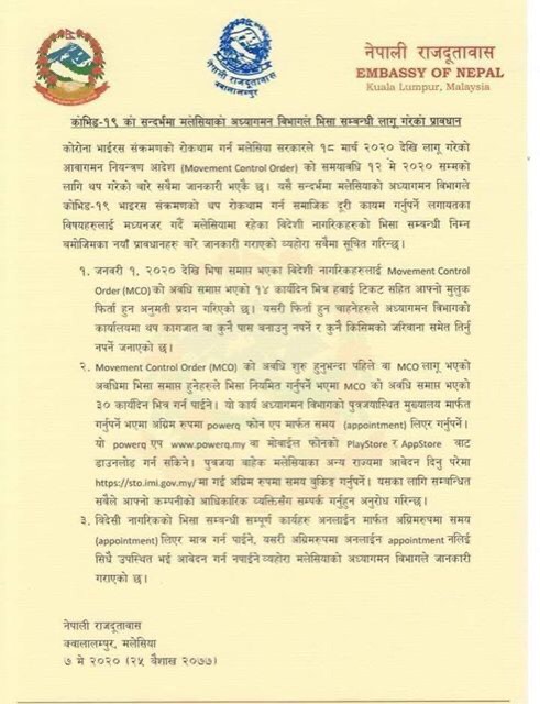 सबै विदेशी नागरिकले भिसा सम्बन्धि सबै काम अनलाइनमार्फत अगाडि नै अपोइन्टमेन्ट लिएर गर्नुपर्ने हुँदा अनलाइन अपोइन्टमेन्ट नलिइ सिधै गएमा आवेदन दिन नपाइने मलेसियाको अध्यागमन विभागले जानकारी गराएको दूतावासले जनाएकाे