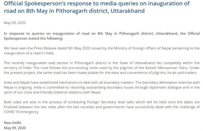 भारतले नेपाल सरकारद्वारा जारी विज्ञप्तिको प्रतिउत्तरमा नेपाल सरकारद्वारा जारी विज्ञप्ति हेरको र पूर्ण रुपमा भारतकै भूमिमा बाटो बनाएको उल्लेख गरेको छ ।