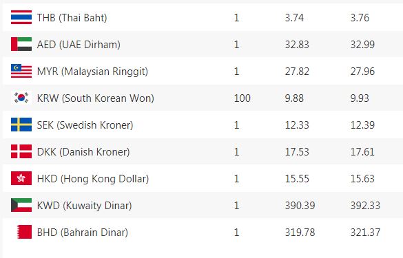 युएई दिराम एकको खरिददर ३२ रुपैयाँ ८३ पैसा छ भने बिक्रिदर ३२ रुपैयाँ ९९ पैसा रहेको छ। मलेसियन रिँगिट एकको खरिददर २७ रुपैयाँ ८२ पैसा तथा बिक्रिदर २७ रुपैयाँ ९६ पैसा रहेको छ।
