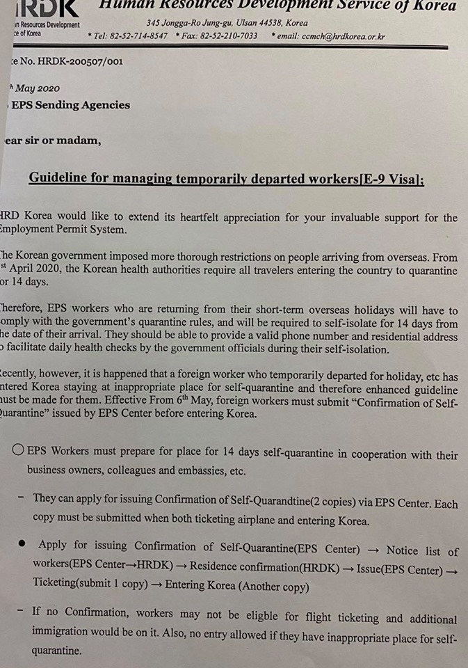 अब काममा फर्किने बेलामा निरोगिताको प्रमाणपत्र मात्रैले नपुग्ने भो। अनिवार्य क्वारेन्टाइनमा बस्नु पर्ने र त्यो ठाउँ चिकित्सकले तोकेको मापदण्डअनुसार हुनुपर्ने भो । अब रोजगारदाताले १४ दिन बस्ने त्यो ठाउँ दिने कुराकाे ग्यारेन्टी कोरिया सरकारले खोजेको छ । नेपालबाट कोरिया पुगेका युवा श्रमिक त्यहाँको निजि क्षेत्रमा कार्यरत छन् ।