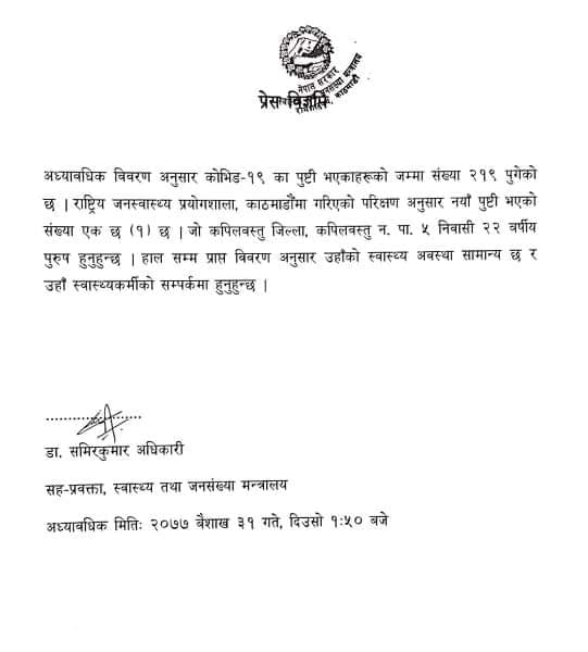 यसैगरी उनका अनुसार राष्ट्रिय जनस्वास्थ्य प्रयोगशालामा परीक्षणका क्रममा कपिलवस्तु जिल्ला, कपिलवस्तु नगरपालिका–५ का २२ वर्षीया पुरुषमा सङ्क्रमण देखिएको हो। योसँगै सङ्क्रमितको सङ्ख्या २१९ जना पुगेको छ।