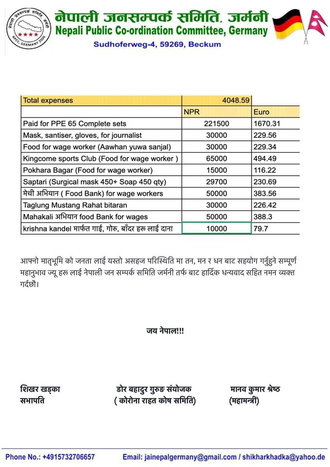 कोरोनाबिरुद्धको अभियानमा जनसम्पर्क समिति जर्मनीको ५ लाख ३५ हजार सहयोग