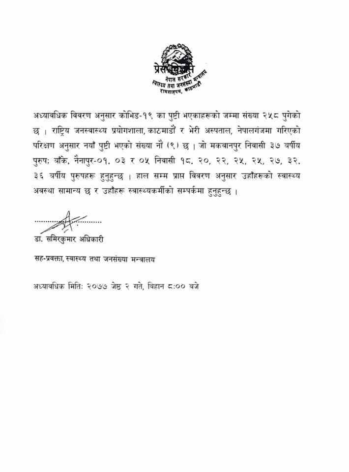 थप नौ जनामा संक्रमण पुष्टि, संक्रमितकाे संख्या २५८ पुग्यो
