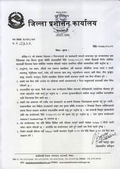शुक्रबार दिउँसो बसेको जिल्ला सुरक्षा समितिको बैठकले मानिसको अनावश्यक भीड नियन्त्रण गर्न यो नियम लागू गरेको हो । जिल्ला प्रशासन कार्यालय काठमाडौंका अनुसार यसअघि जारी भएका सबै ई–पास र पहेँलो रङको समेत खारेज भएको छ । अब जारी हुने पास नीलो रङको हुने छ । गह्रौं सवारीसाधनलाई बेलुकी ८ बजेदेखि बिहान ६ बजेभित्र मात्र हिँड्न दिने निर्णय जिल्ला सुरक्षा समितिले गरेको हो।