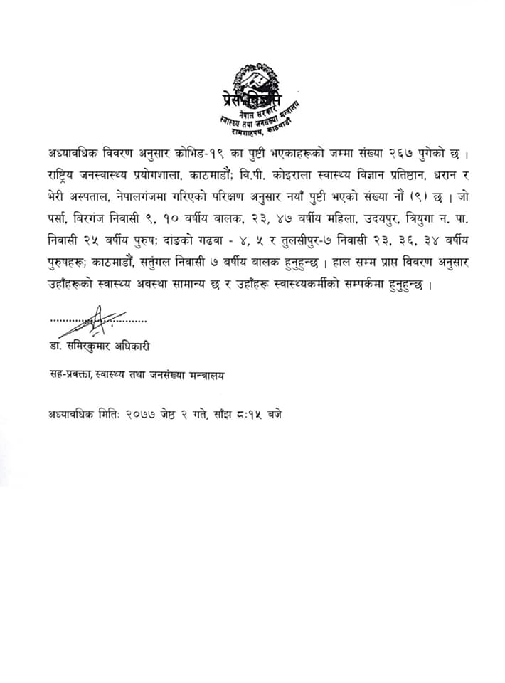 काठमाडौं । कोरोनाबाट संक्रमित हुनेको संख्या बढेको छ । शुक्रबार साँझको अध्यावधिक अनुसार थप ९ जनामा कोरोनाको संक्रमण पुष्टि भएको स्वास्थ्य तथा जनसंख्या मन्त्रालयका सहप्रवक्ता डा. समिरकुमार अधिकारीले जनाएका छन् ।