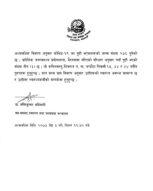 यो सँगै नेपालमा कारोना संक्रमितको संख्या २७६ पुगेको स्वास्थ्य तथा जनसंख्या मन्त्रालयले जनाएको छ।