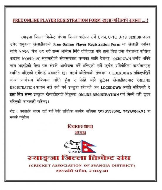 यो अवस्थामा जिल्लाका खेलाडीहरुलाइ जिल्ला छनोटका लागि कार्यालयमा आइ आफ्नो बिबरण दर्ता गर्न असम्भव रहेकाले स्याङजा जिल्ला क्रिकेट संघले सबै जिल्ला छनोटका गतिविधिमा सहभागी गराउनका लागि खेलाडी दर्ता प्रक्रियालाई सहजिकरण गर्न निशुल्क रुपमा ONLINE PLAYER REGISTRATION FORM सन्चालन गरेको थियो । उक्त प्रक्रिया अन्र्तगत जिल्लामा रहेका खेलाडीहरुले मार्फत आफ्नो बिवरण दर्ता गराएका थिए ।