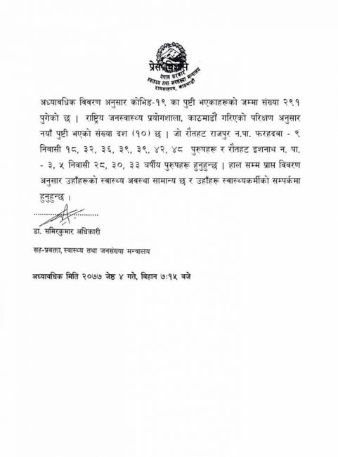 स्वास्थ्य मन्त्रालयका सहप्रवक्ता डा. समिरकुमार अधिकारीका अनुसार नयाँ पुष्टि भएका १० जना रौतहटको राजपुर नगरपालिका फरहदा–९ निवासी १८, ३२, ३६, ३९, ३९, ४२, ४८ वर्षीय पुरुषहरु रहेका छन् ।