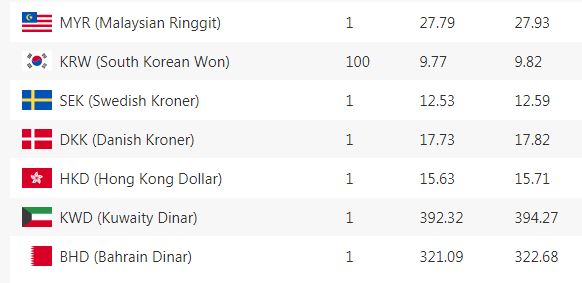 युएई दिराम एकको खरिददर ३३ रुपैयाँ छ भने बिक्रिदर ३३ रुपैयाँ १७ पैसा रहेको छ। मलेसियन रिँगिट एकको खरिददर २७ रुपैयाँ ७९ पैसा तथा बिक्रिदर २७ रुपैयाँ ९३ पैसा रहेको छ।