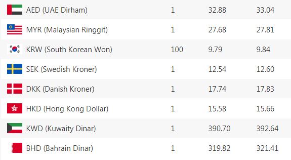 युएई दिराम एकको खरिददर ३२ रुपैयाँ २८ पैसा छ भने बिक्रिदर ३३ रुपैयाँ ४ पैसा रहेको छ। मलेसियन रिँगिट एकको खरिददर २७ रुपैयाँ ६८ पैसा तथा बिक्रिदर २७ रुपैयाँ ८१ पैसा रहेको छ।