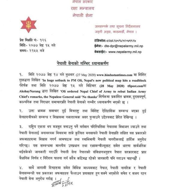 नेपाली सेनाले भारतको पत्रिका हिन्दूस्तान टाइम्समा शिशिर गुप्ताद्धारा लिखित ‘In huge setback to PM Oli, Nepal’s new political map hits a roadblock’ शिर्षक तथा टीएफआई पोष्टमा अक्षय नारंगद्धारा लिखित ‘Oli ordered Nepal Chief of Army to rebut Indian Army Chief’s remarks, the Nepalese General said ‘No thanks ‘शिर्षकमा प्रकाशित भ्रामक, दुरासयपूर्ण, काल्पनिक तथा निराधार समाचारप्रति नेपाली सेनाको गम्भीर ध्यानाकर्षण भएको भन्दै प्रतिपाद गरेको हो ।