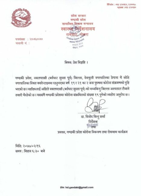 गण्डकी प्रदेश, नवलपरासी (बर्दघाट सुस्ता पूर्व) जिल्ला, देबचुली नगरपालिका ठेगाना भै सोहि नगरपालिका स्थित क्वारेन्टाइनमा रहेका बर्ष १९ र २१ का २ जना पुरुषमा कोरोना संक्रमण देखिएको गण्डकी प्रदेश, सामाजिक विकास मन्त्रालयले पुष्टि गरेको छ ।