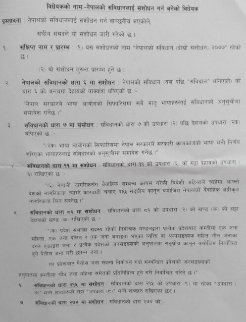 काठमाडौं । राष्ट्रिय जनता पार्टी लिएको संविधान संशोधन विधेयकको प्रस्ताव संसद सचिवालयले दर्ता नगरी पठाएको छ। नेपालको संविधानलाई संशोधन गर्न बनेको विधेय दर्ता गर्न गएको र सचिवालय महासचिव भरतराज गौतमले समय नभएको भन्दै फकाएको राष्ट्रिय जनता पार्टीका महासचिव केशव झाले बताए।