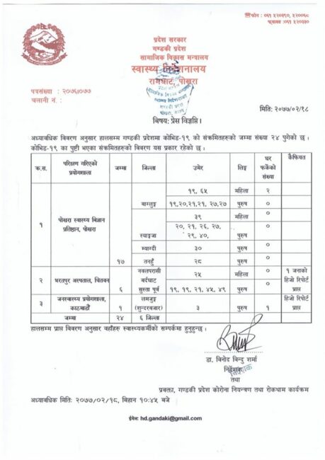 यो सँगै गण्डकी प्रदेशमा कारोना संक्रमितको संख्इा २४ पुगेको छ । जसमध्ये तीन संक्रमित निको भएर घर फर्किसकेका छन् ।