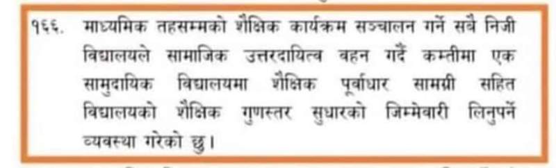 बजेटमा माध्यमिक तहको निजी विद्यालयले सामाजिक उत्तरदायित्वअन्तर्गत कम्तीमा एक सामुदायिक विद्यालयको शैक्षिक पूूर्वाधारसहित शैक्षिक गुुणस्तर सुधारको जिम्मेवारी बहन गर्नुपर्ने उल्लेख छ । हाल कूल ३५ हजार विद्यालयमध्ये करीब साढे छ हजार निजी विद्यालय सञ्चालित छन् । यस प्रावधानबारे सत्तारूढ नेपाल कम्युनिष्ट पार्टी (नेकपा) भित्रै विभिन्न कोणबाट बहस उत्पन्न भएपछि शिक्षामन्त्रीले आइतबार विज्ञप्ति जारी गरेको देखिएको छ । सो प्रस्ताव समाजवादोन्मुख शिक्षा नीतिसँग मेल नखाने र सामुदायिक विद्यालयलाई झन् अपमान गराउने टिप्पणी व्यक्त भएका छन् ।
