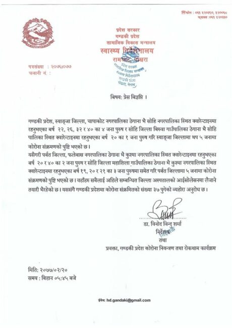 स्वास्थ्य निर्देशनालय, गण्डकी प्रदेश पोखराका अनुसार स्याङ्जाको चापाकोट नगरपालिका ठेगाना भई सोहि नगरपालिका स्थित क्वारेन्टाइनमामा बसेका बर्ष २२, २६, ३२ र ४० का ४ जना पुरुष र बिरुवा गाउँपालिका ठेगाना भई सोहि पालिका स्थित क्वारेन्टाइनमा बसेका बर्ष २० का १ जना पुरुषमा कोरोना पुष्टि भएको हो।